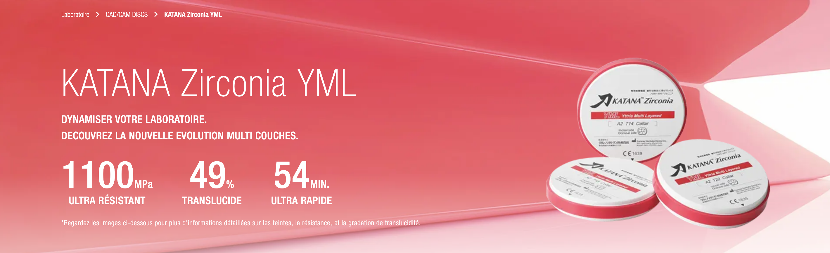 KATANA™ Zirconia YML combines three materials with different yttria concentrations, offering a well-balanced combination of color/translucency and flexural strength gradation.